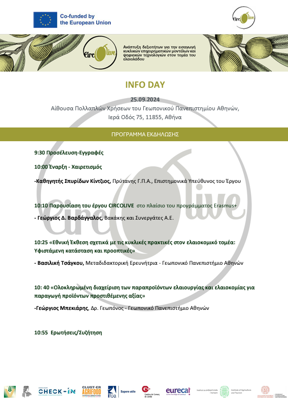 Την Τετάρτη 25 Σεπτεμβρίου 2024 στις 10:00 στην Αίθουσα Πολλαπλών Χρήσεων του Γεωπονικού Πανεπιστημίου Αθηνών θα πραγματοποιηθεί ενημερωτική εκδήλωση για την παρουσίαση του έργου με τίτλο «Developing skills for introducing circular business models and digital technologies in olive oil sector–CIRCOLIVE». Στο έργο συμμετέχουν ως εταίροι το Γεωπονικό Πανεπιστήμιο Αθηνών και επτά εταιρίες/οργανισμοί από τέσσερις χώρες.