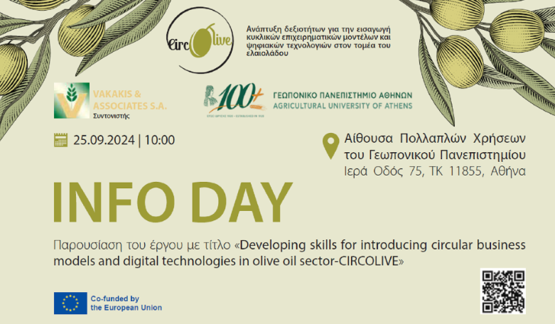 Την Τετάρτη 25 Σεπτεμβρίου 2024 στις 10:00 στην Αίθουσα Πολλαπλών Χρήσεων του Γεωπονικού Πανεπιστημίου Αθηνών θα πραγματοποιηθεί ενημερωτική εκδήλωση για την παρουσίαση του έργου με τίτλο «Developing skills for introducing circular business models and digital technologies in olive oil sector--CIRCOLIVE».